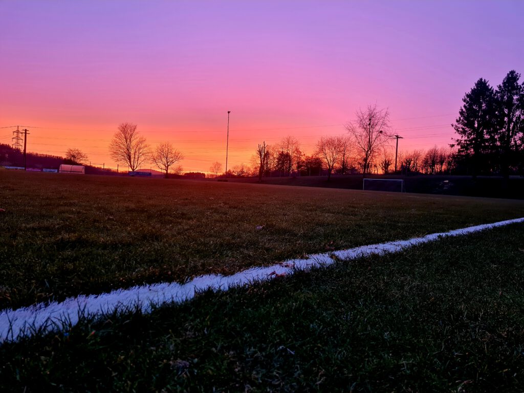 Am vergangenen Mittwoch (27.03.) fand bereits unser sechstes Freiluft-Training auf dem Sportplatz in Meudt statt. Die 15 Teilnehmer hatten eine anstrengende Einheit mit einem kleinen Turnier 3 gegen 3 auf vier Tore hinter sich, als Sie folgendes Farbenspiel der untergehenden Sonne miterleben durften. Das war neben den Kaltgetränken eine tolle Belohnung und ein schöner Abschluss des Tages.