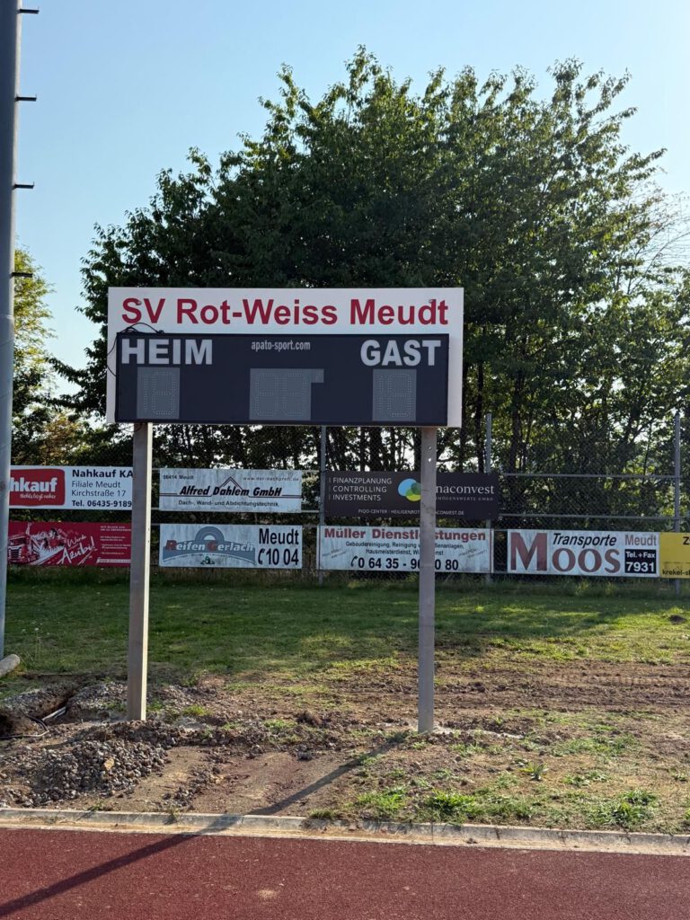 Die Anschaffung der Anzeigetafel wurde durch die Unterstützung von Müller Dienstleistungen, Unternehmensberatung Axel Keller, Schreinerei Lauf, Rechtsanwälte Gläser und der Ortsgemeinde Meudt möglich. An dieser Stelle möchten wir uns herzlich für die Unterstützung bedanken. Durch die Anzeigetafel wird unsere schöne Sportanlage weiter aufgewertet ![]()