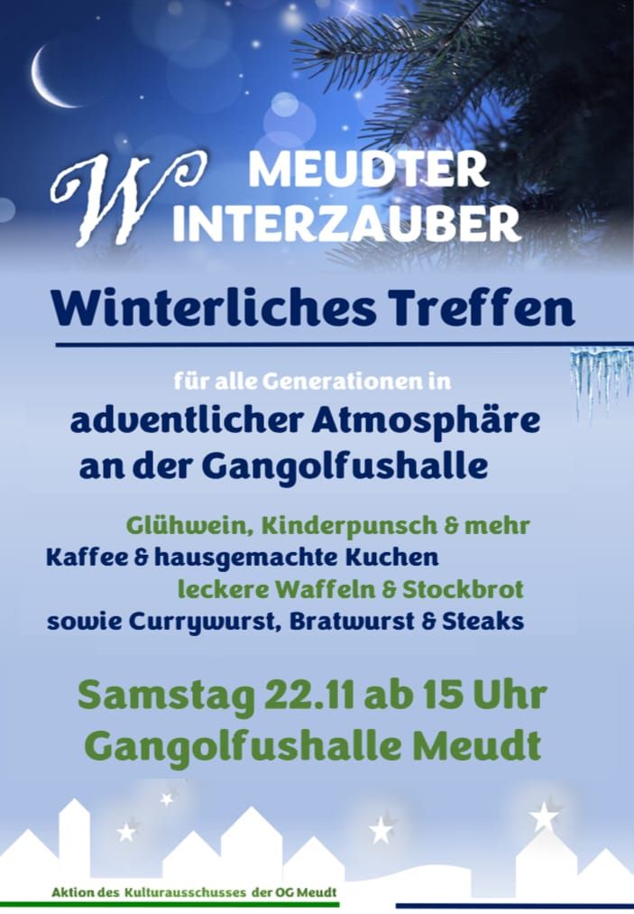 Am Samstag, den 22.11 findet an der Gangolfushalle der diesjährige Meudter Winterzauber statt. Seitens des SV Meudt versorgen wir euch mit leckeren Bratwürsten, Steaks und Currywurst.