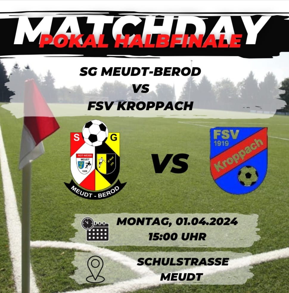 An Ostermontag empfangen wir im Halbfinale des Kreispokals den FSV Kroppach. Anpfiff der Partie ist um 15:00 Uhr in Meudt.